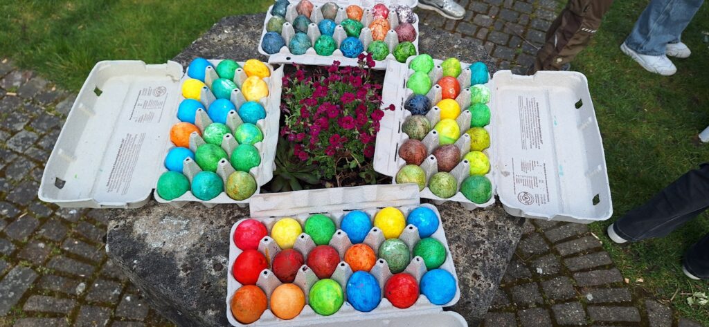Am Ostersamstag trafen sich zahlreiche Kinder, um im Pfarrgarten Ostereier zu färben. Mit großer Begeisterung ging es ans Werk. Und so waren 130 Eier in Windeseile bunt gefärbt. Die Ostereier wurden anschließend in den Festgottesdiensten in Hembsen und Beller an die Besucher verteilt.