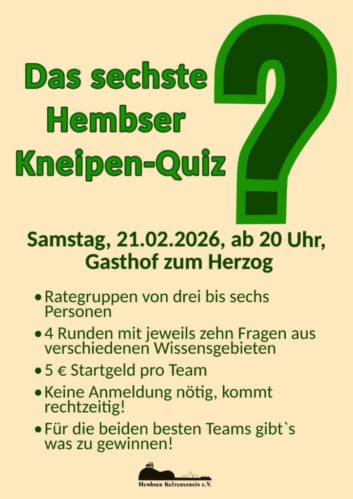 …im Gasthof „Zum Herzog“. Beginn 20:00 Uhr. Kommt bitte rechtzeitig, wenn die Kneipe voll ist, ist sie leider voll… Ihr könnt Teams zw. 3 und 6 Personen bilden und müsst Fragen aus allen möglichen Wissensgebieten beantworten sowie in der letzten Runde Musikstücke und Filme erkennen – das 1. und 2. Gewinner-Team gewinnt einen Preis!
