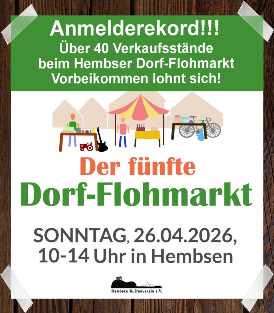 Der Hembser Kulturverein e.V. veranstaltet bereits zum 5. Mal den beliebten Hembser Dorf-Flohmarkt mit dem Zentrum beim Pfarrheim an der Kirche, aber mit Verkaufsständen über’s ganze Dorf verteilt! Der Dorf-Flohmarkt läuft von 10 bis 14 Uhr. Den Plan mit den Verkaufsständen gibt es, auch zum Download, auf der Webseite des Kulturverein!