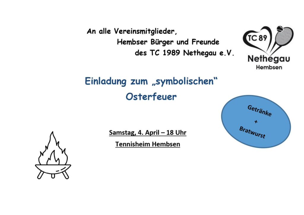 Wie bereits im vergangenen Jahr, lädt der Tennisverein TC 89 Nethegau alle Vereinsmitglieder, Hembser Bürger/-innen und Freunde des Vereins zum „symbolischen“ Osterfeuer am Tennisplatz ein.